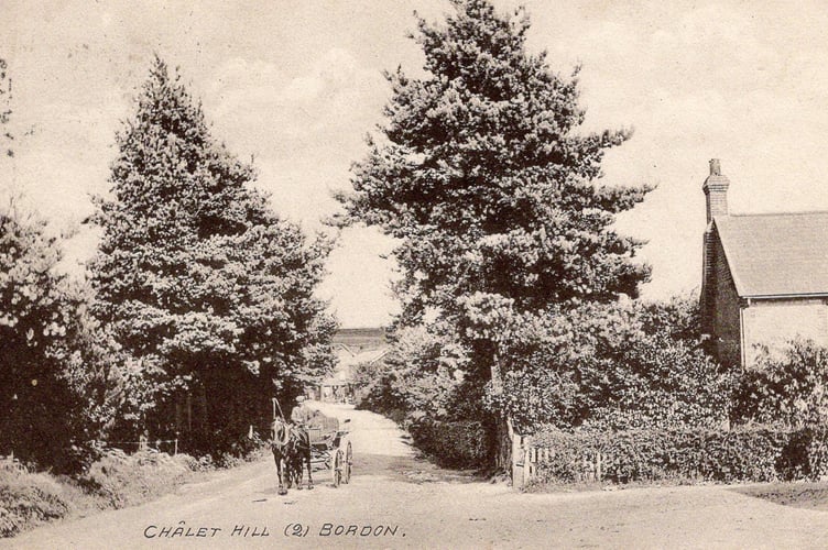The photographs featured here are from postcards in the WFHS archive. One, dated 1905, is looking down ‘Deadwater Hill’, now Chalet Hill, showing a farmhouse at the bottom where the Bordon Mineral Water Company (later Allen & Lloyd) was located.
