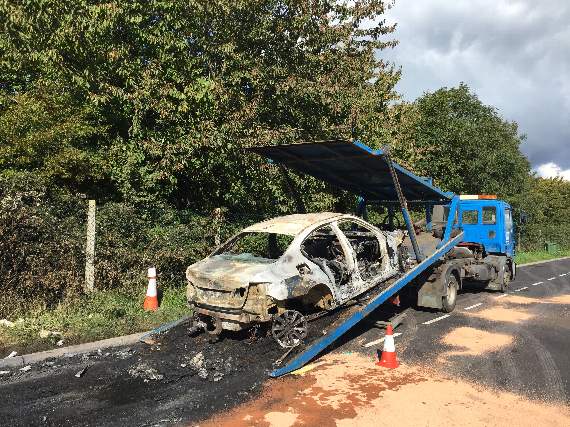The black BMW 5 Series car was fully ablaze in a lay-by between the Petersfield and Liphook exits, when they arrived at about 9.10am, on Friday, October 9.